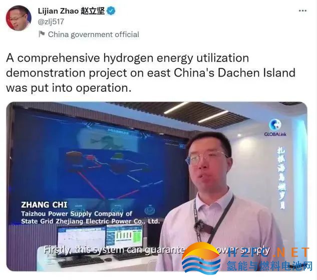 據(jù)悉,這并不是外交部發(fā)言人首次向全球“帶貨”中國氫能項目。2022年7月,中國外交部新聞發(fā)言人趙立堅在海外社交媒體Twitter(推特)上發(fā)文“A comprehensive hydrogen energy utilization demonstration project on east China's Dachen Island was put into operation。”并配發(fā)新華社“全球連線”的英文視頻報道“GLOBAlink | Green hydrogen project in E China contributes to low-carbon development”,向世界各國網(wǎng)友介紹國家電網(wǎng)浙江臺州大陳島氫能綜合利用示范工程,展示以國網(wǎng)浙江電力為代表的中國企業(yè)探索建設(shè)新型電力系統(tǒng),以海島“綠氫”工程助力實現(xiàn)“雙碳”目標的實踐。