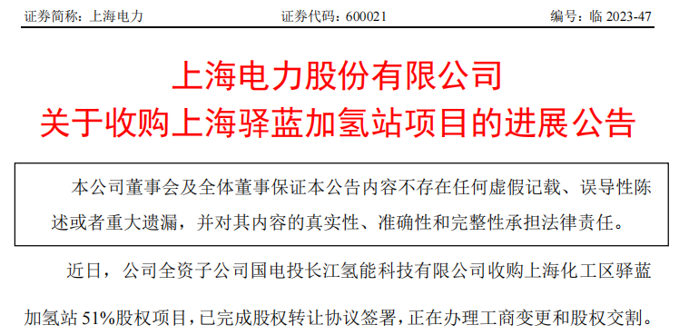 2023年5月22日,上海電力發布公告稱,“近日,公司全資子公司國電投長江氫能科技有限公司收購上海化工區驛藍加氫站51%股權項目,已完成股權轉讓協議簽署,正在辦理工商變更和股權交割”。
