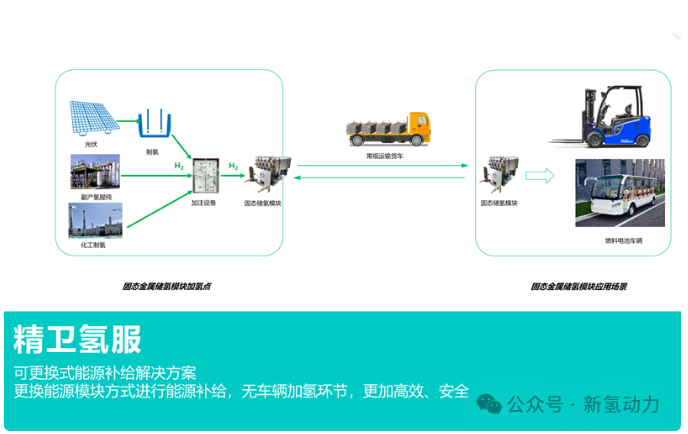 新氫動力是首家實現(xiàn)固態(tài)金屬儲氫技術在燃料電池叉車、觀光車上車應用的技術公司,固態(tài)金屬儲氫技術因其高穩(wěn)定性(常態(tài)化特性)、高安全性(非氣態(tài)氫存儲)、高便捷性(可更換金屬儲氫模塊完成能源補給)等特質,是助力燃料電池技術產業(yè)化推廣與應用的重要解決方案。新氫動力所打造的“精衛(wèi)氫服”一體一鏈式氫能的“加、儲、運、用”解決方案,解決用戶安全焦慮的同時,可以快速助力燃料電池叉車、觀光車的產業(yè)化、商業(yè)化應用。
