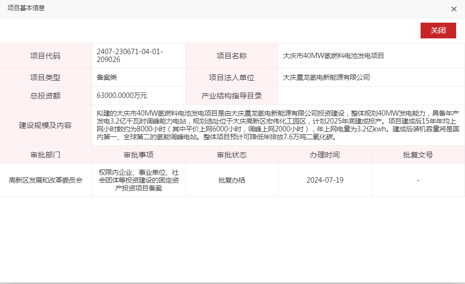 近日,黑龍江大慶市40MW氫燃料電池發電項目獲備案。