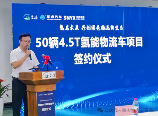 簽約儀式由重慶地大工研院總經理李濤主持,他代表項目合作單位對出席活動的領導、嘉賓表示歡迎和感謝。他表示,氫能已成為全球能源轉型的重要載體之一,聯合開展氫能物流車示范應用,攜手打造氫能汽車產業生態,對推動氫能產業發展,促進物流綠色轉型具有重要意義。