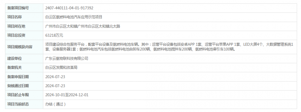 近日,廣東云氫物聯科技有限公司白云區氫燃料電池汽車應用示范項目獲備案。