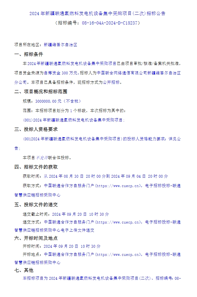 8月30日,中國招標采購網發布2024年新疆聯通氫燃料發電機設備集中采購項目(二次)招標公告。