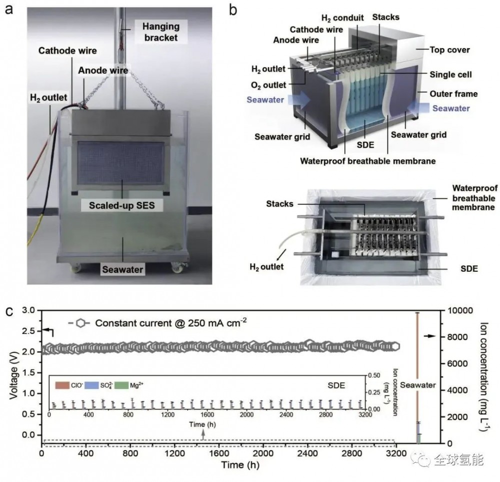 與此同時(shí),團(tuán)隊(duì)研制了全球首套400L/h海水原位直接電解制氫技術(shù)與裝備,在深圳灣海水中連續(xù)運(yùn)行超3200小時(shí),從海水中實(shí)現(xiàn)了穩(wěn)定和規(guī)模化制氫過(guò)程,令人信服。