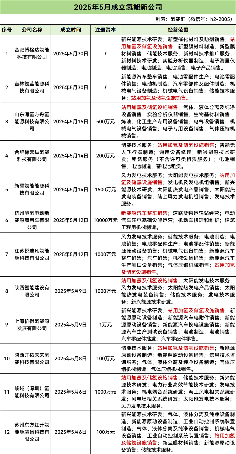 不完全統計,2025年5月,國內先后有12家氫能公司成立。