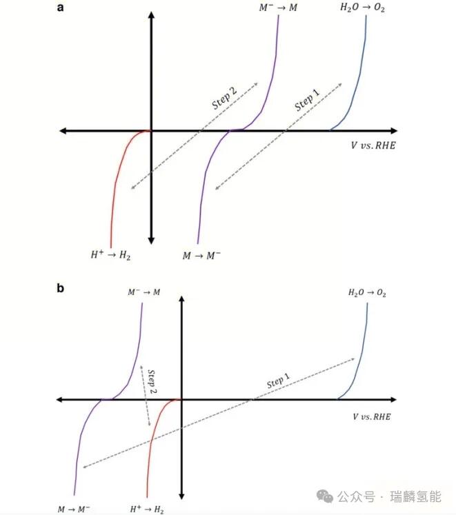 圖3:解耦水分解系統(tǒng)的設(shè)想電流-電壓行為。(a) E0(M0/-)介于E0(H+ /H2)和E0(O2/H2O)之間,將水分解所需的熱力學(xué)電壓分為兩個(gè)非自發(fā)步驟。(b) E0(M0/-)不在E0(H+ /H2)到E0(O2/H2O)的范圍內(nèi)。