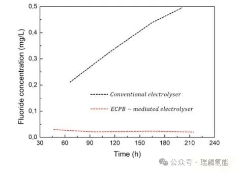 圖5:傳統(tǒng)電解槽和sta介導(dǎo)電解槽溶液中氟化物濃度隨時(shí)間變化的比較。氟化物是Nafion分解的產(chǎn)物