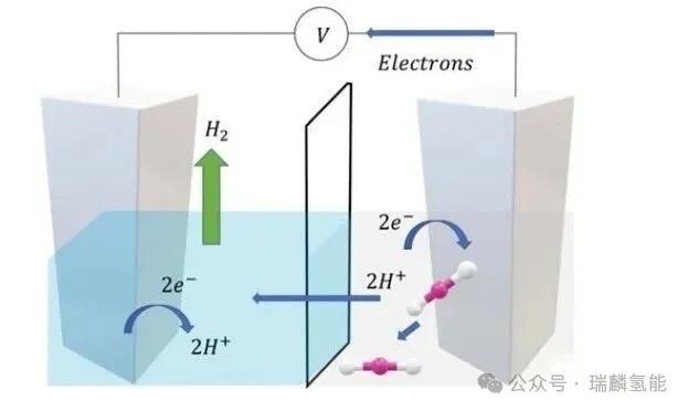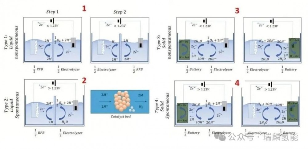 在解耦體系中,HER與氧化態(tài)介質(zhì)(M?)的氧化耦合,OER則與還原態(tài)介質(zhì)(M)的還原關(guān)聯(lián)。整體反應(yīng)仍等效于水分解(2H?O→2H?+O?),介質(zhì)以氧化還原液流電池或固態(tài)電池模式循環(huán)。系統(tǒng)輸入僅需水和電能,輸出為獨(dú)立收集的H?和O?。