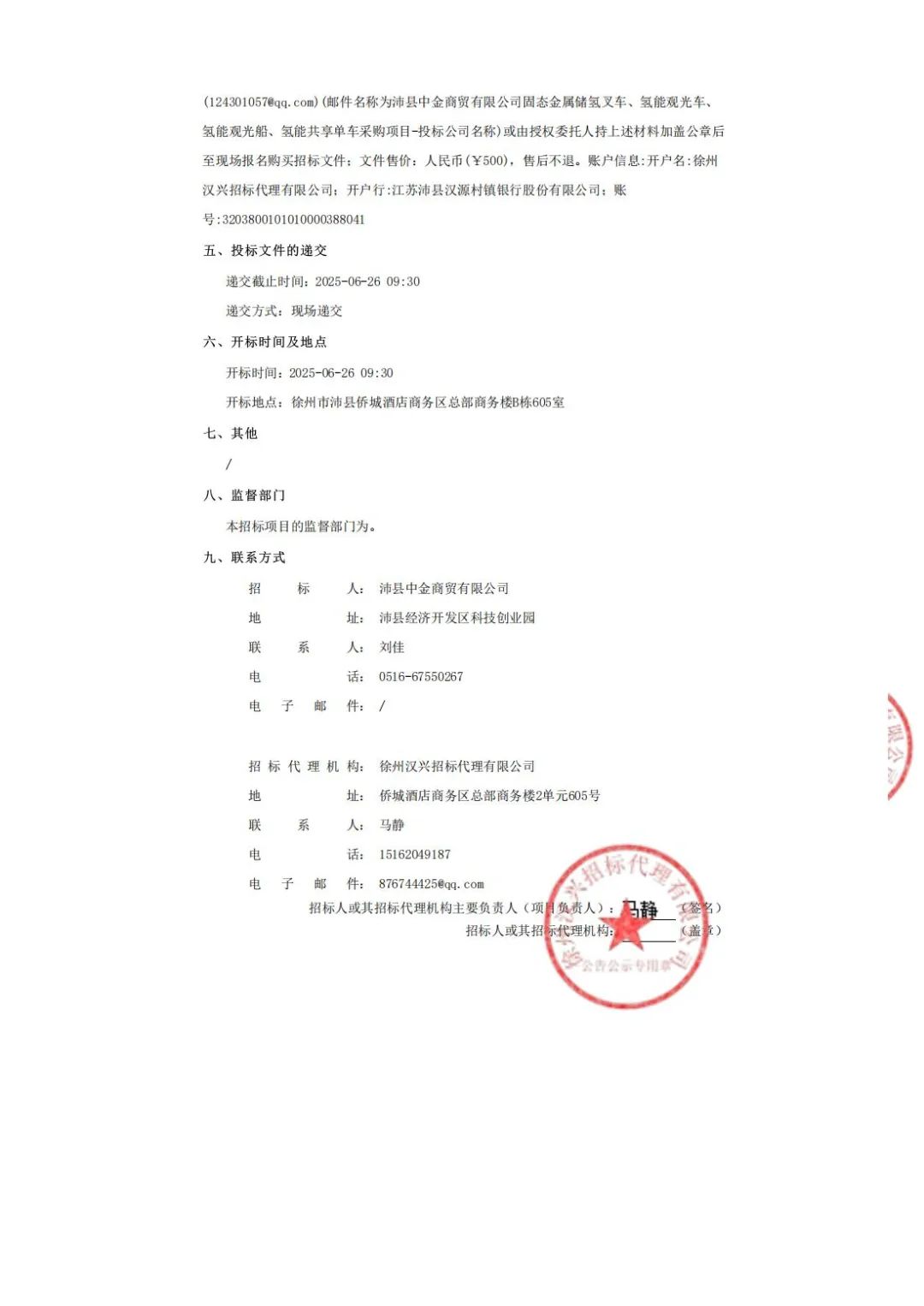 6月5日,沛縣中金商貿(mào)有限公司固態(tài)金屬儲氫叉車、氫能觀光車、氫能觀光船、氫能共享單車采購項目公開招標(biāo)公告。