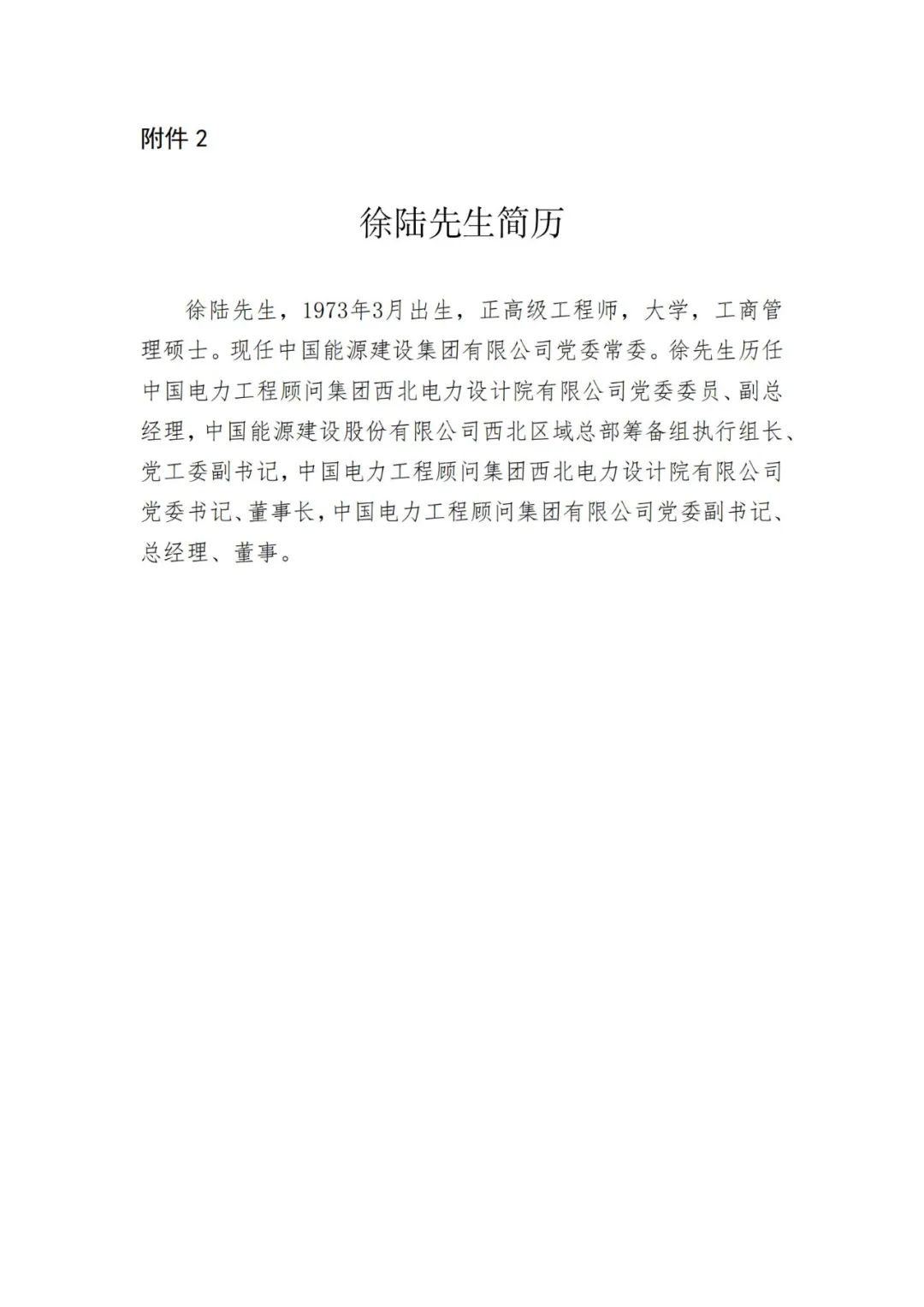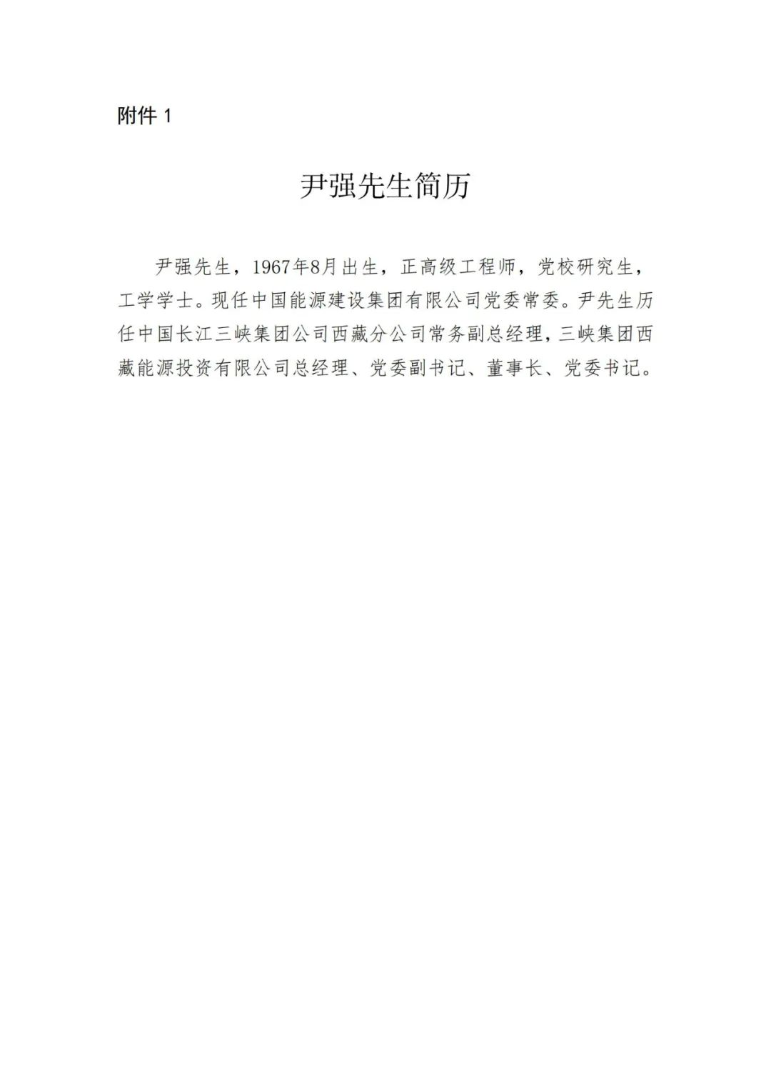 公告顯示,尹強先生,1967年8月出生,正高級工程師,黨校研究生,工學學士。現任中國能源建設集團有限公司黨委常委。尹先生歷任中國長江三峽集團公司西藏分公司常務副總經理,三峽集團西藏能源投資有限公司總經理、黨委副書記、董事長、黨委書記。