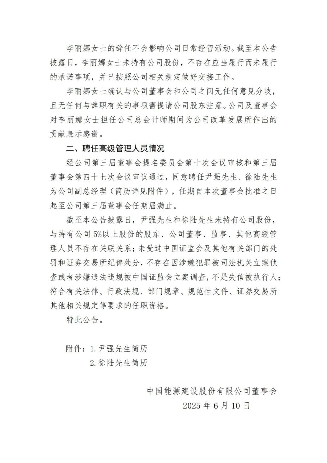 公告稱,中國能建于2025年6月9日召開第三屆董事會第四十七次會議,審議通過了《關于調整公司高級管理人員的議案》,因工作變動原因,李麗娜辭任中國能建總會計師職務。
