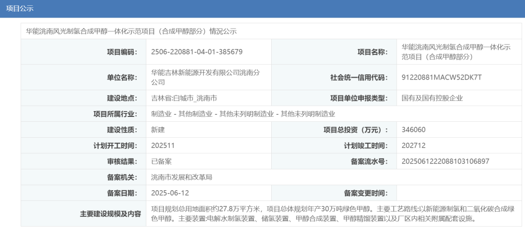 6月12日,華能洮南風光制氫合成甲醇一體化示范項目(合成甲醇部分)情況公示,該項目取得備案。