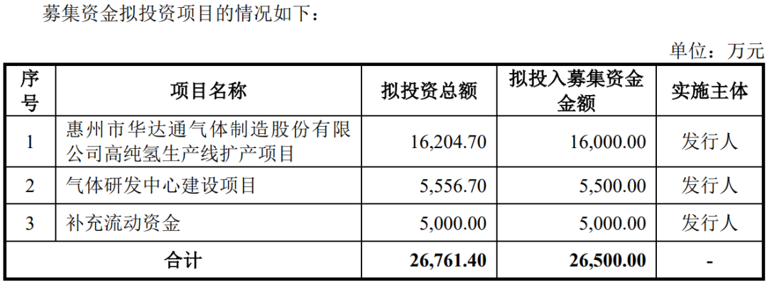 招股說明書顯示,本次募集資金投資項(xiàng)目計(jì)劃總投資為26,761.4萬元,預(yù)計(jì)將投入募集資金26,500萬元進(jìn)行建設(shè)。本次發(fā)行募集資金用于高純氫生產(chǎn)線擴(kuò)產(chǎn)項(xiàng)目、氣體研發(fā)中心建設(shè)項(xiàng)目和補(bǔ)充營運(yùn)資金項(xiàng)目。