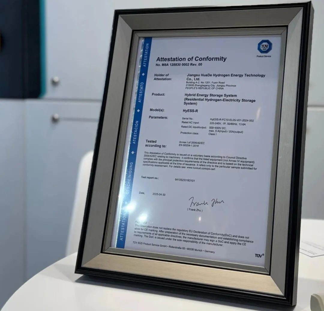 公司產品貫徹國標與國際標準雙軌制,HyESS-R系列系統可支撐多項團體標準的可行性驗證。2025年獲得的 TüV 南德 CE 認證,不僅為產品進入歐洲市場鋪平道路,更通過嚴苛測試反哺國內技術迭代。