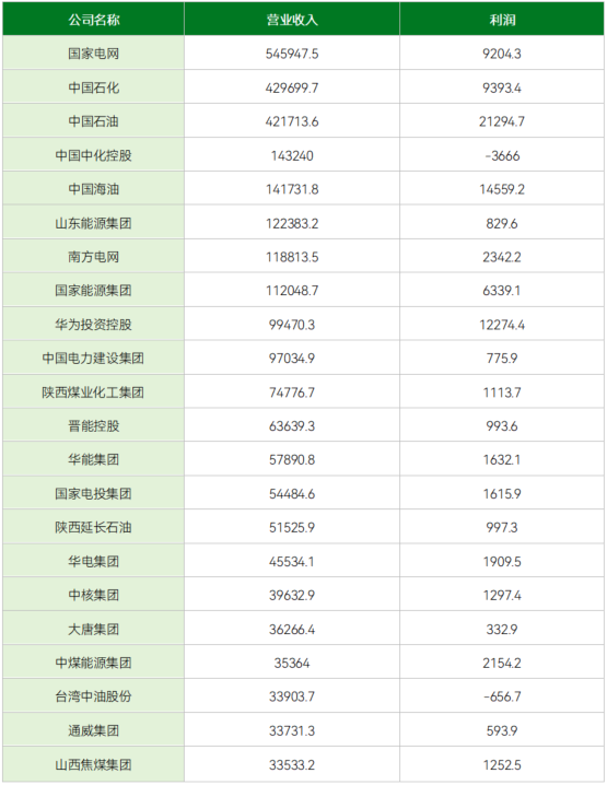 表 2 2024年500強(qiáng)中國能源企業(yè)營收及利潤