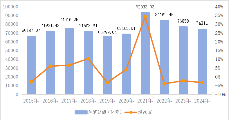 2024年,全國規(guī)模以上工業(yè)企業(yè)實現(xiàn)利潤總額74310.5億元,比上年下降3.3%。