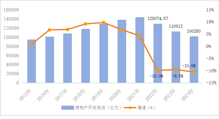 ?2024年全國房地產(chǎn)開發(fā)投資總額為100280億元,同比下降10.6%?。其中,住宅投資為76040億元,同比下降10.5%?。與前幾年相比,2024年的降幅有所擴(kuò)大,2023年房地產(chǎn)開發(fā)投資下降9.45%,2022年下降10.02%,而2021年則為正增長4.26%?。