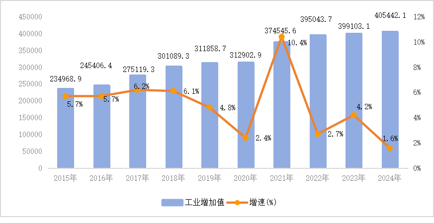 圖 4 2015-2024年全部工業(yè)增加值及增速