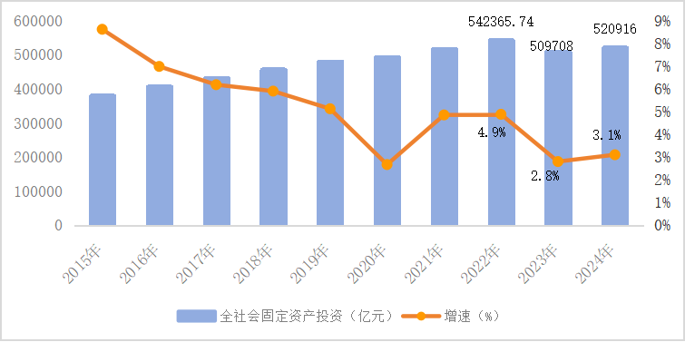 ?2024年全社會固定資產(chǎn)投資總額為520916億元,同比增長3.1%??。其中,固定資產(chǎn)投資(不含農(nóng)戶)為514374億元,同比增長3.2%?。