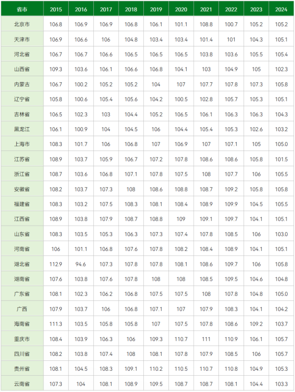 表 1 2015-2024年中國各省份地區(qū)生產(chǎn)總值GDP指數(shù)
