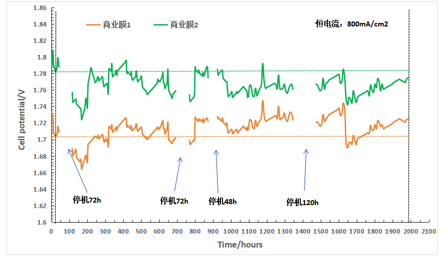 穩石氫能目前采用CCS工藝制備膜電極,產能可達10000m2/年,全電池下,10mA/cm2過電位為117mV,800mA/cm2時電位1.71V,2000h下測試性能衰減低于0.01mV/h。穩石氫能的膜電極性能優異,壽命長,目前已達到商業化應用條件。