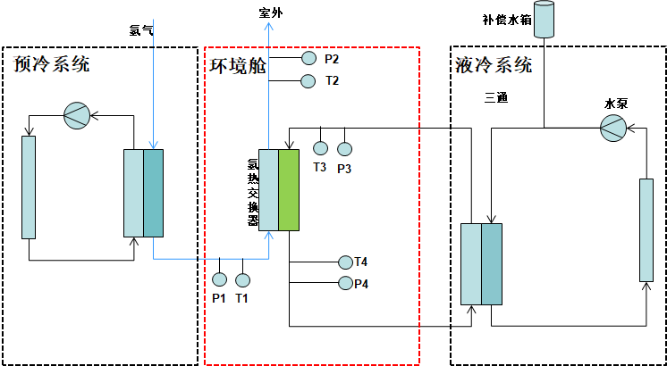 將板式換熱器布置在環境艙內,一側連接液冷系統,另一側連接被測氣體/液體的預冷/熱系統,在進出口兩端分別安裝壓力和溫度傳感器。