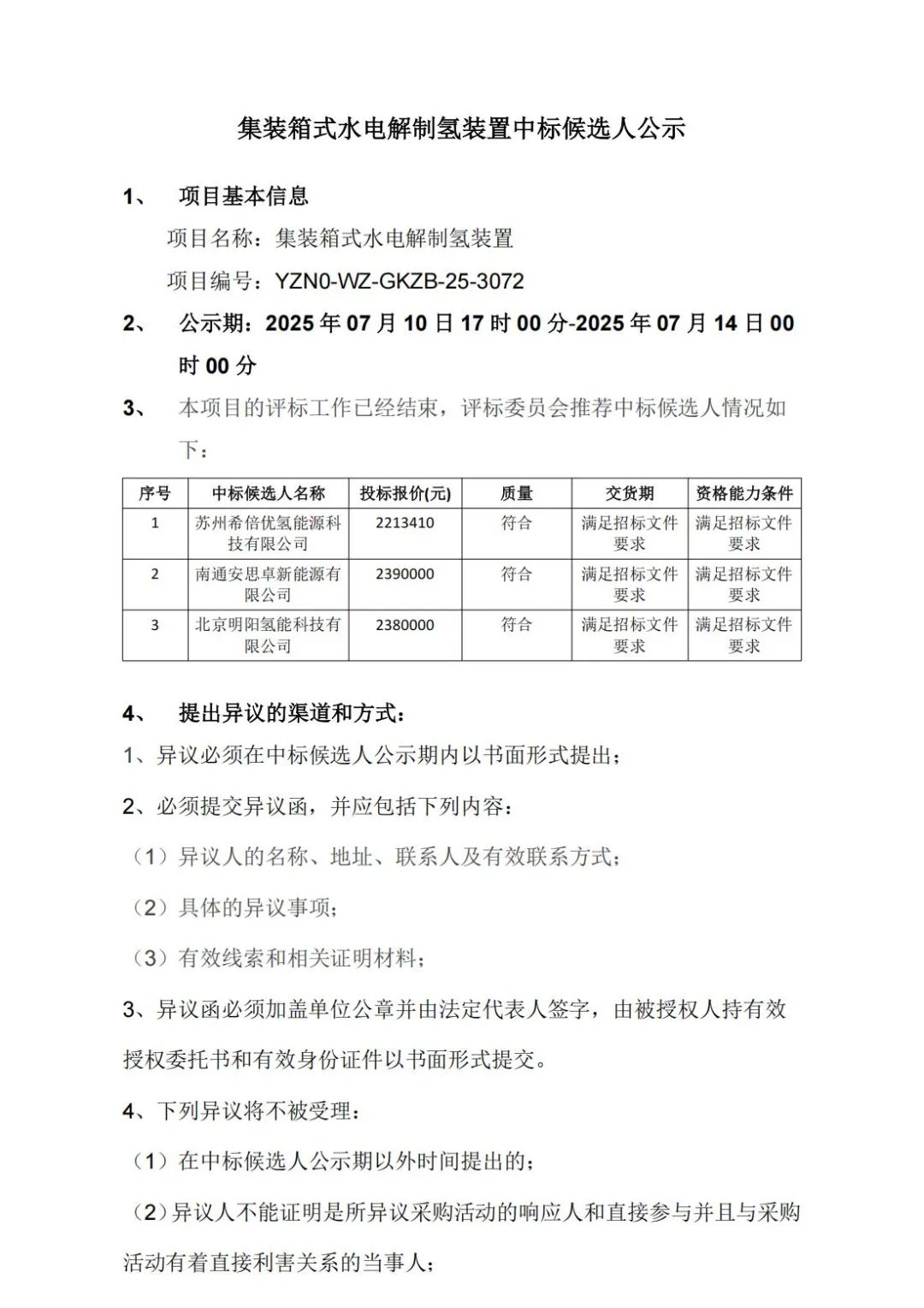 7月10日,集裝箱式水電解制氫裝置中標候選人公示。
