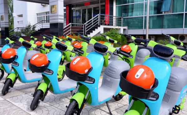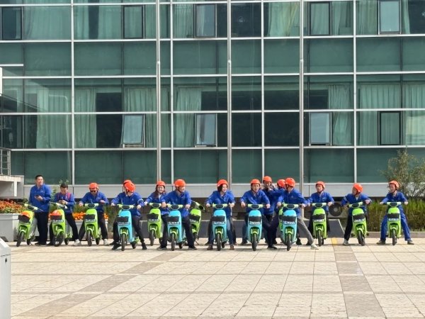 在北方稀土貯氫公司辦公樓門前,一排排氫能電動兩輪車整齊列隊。藍綠相間的車體色彩明快亮眼,車筐里的橙色頭盔尤為醒目,車身一側的包鋼集團標志格外引人注目。車頭嵌入的智能顯示屏上,續航數據正在實時跳動,清晰直觀地展現著車輛的運行狀態。