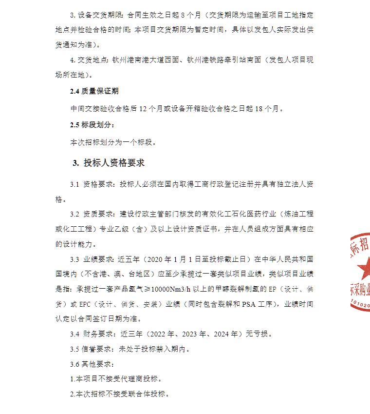 2、設備采購:包含15000Nm3/h甲醇裂解制氫裝置1套,以及配套的非標/標準、工藝設備、儀表(含程控閥門)、催化劑和吸附劑和隨機備件供貨備采購(含備品備件)等。