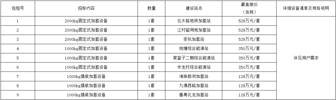 根據招標公告,采購2000kg固定式加氫設備,最高限價528萬元/套;1000kg固定式加氫設備,最高限價350萬元/套;1000kg撬裝加氫設備,最高限價128萬元/套。