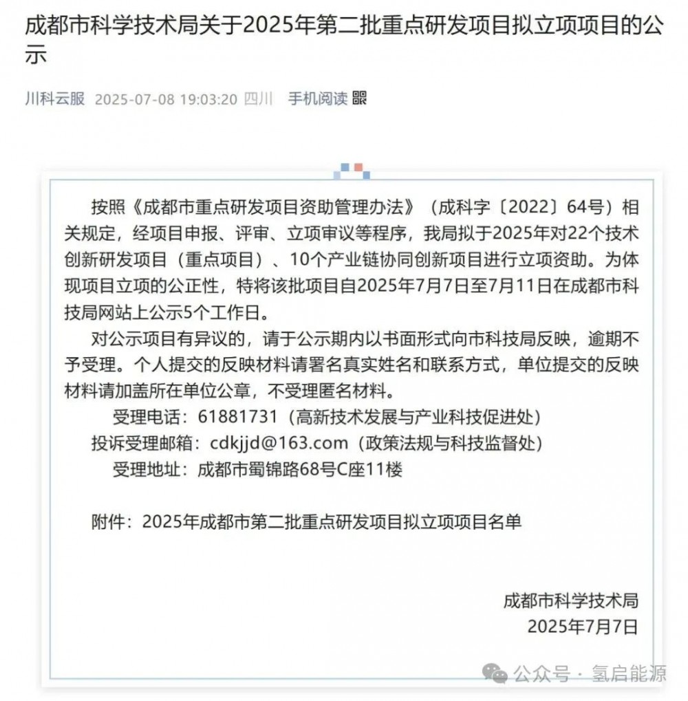 2025年7月,氫啟能源參與聯(lián)合申報的“2025年成都市第二批重點研發(fā)項目”進(jìn)行了擬立項項目公示。截止發(fā)稿,項目公示已經(jīng)完成,項目正式立項。該項目也是本批次10個“產(chǎn)業(yè)鏈協(xié)同創(chuàng)新項目”中唯一一個氫能項目,獲得580萬元項目立項資助。