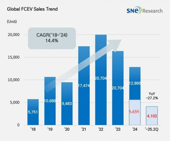 SNE Research的圖表顯示近年來全球FCEV銷售的漲跌。紅色文字突出顯示的框是2024年和2025年上半年的銷售數據。圖片來源:SNE Research