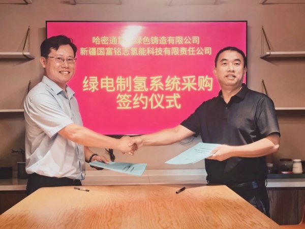 2025年8月18日,國富氫能全資控股公司新疆國富銘志氫能科技有限責任公司(以下簡稱 “國富銘志”)與哈密通慧德綠色鑄造有限公司(以下簡稱 “哈密通慧德”)在哈密正式簽訂采購合同,雙方就氫能核心裝備采購達成深度合作,標志著國富氫能電解制氫技術在西北工業(yè)場景的規(guī)模化應用邁出關鍵一步。
