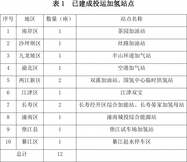 截至目前,全市已建成并投入運(yùn)營加氫站12座,其中,9座為公共服務(wù)領(lǐng)域加氫站,3座為特殊用途供氫設(shè)施(不對車輛經(jīng)營性加注,為供氫母站和試車用氫氣)。主要覆蓋兩江新區(qū)、九龍坡區(qū)、長壽區(qū)等核心產(chǎn)業(yè)區(qū)及交通節(jié)點(diǎn),總加注能力7500千克/日,初步形成服務(wù)示范車輛運(yùn)行的加氫站點(diǎn)網(wǎng)絡(luò)雛形,為氫燃料電池汽車的推廣運(yùn)行提供了基礎(chǔ)保障。