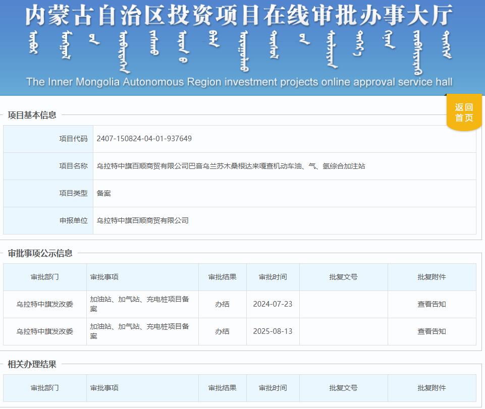近日,烏拉特中旗百順商貿有限公司巴音烏蘭蘇木桑根達來嘎查機動車油、氣、氫綜合加注站獲備案。