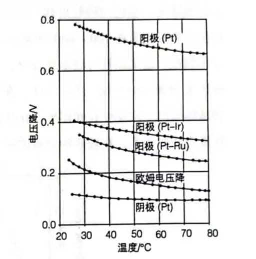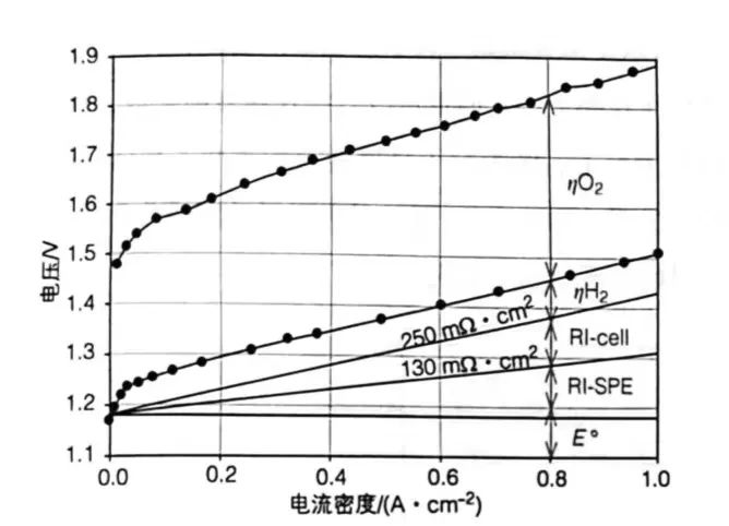 圖 2 給出了 90 ℃、常壓條件下,小室電壓與工作電流密度的對應(yīng)關(guān)系。在此溫度下,水分解的理論自由能電壓約為 1.18 V。實際測量中,SPE 的離子電阻及非 MEA 構(gòu)件的電子電阻構(gòu)成了兩項隨電流密度線性增加的歐姆損耗;若能將 1 A·cm?2 時的電池面電阻控制在 x mΩ·cm2,則對應(yīng)的電壓損失僅為 x mV。陰極氫析出反應(yīng)(HER)因動力學(xué)較快,其過電位 η_H? 通常較小;相比之下,陽極氧析出反應(yīng)(OER)過電位 η_O? 明顯更高,成為能量損失的主導(dǎo)項。雖然 RuO? 的催化活性優(yōu)于 IrO?,但高電位下 RuO? 易被腐蝕失活,因此工業(yè)上仍主要采用 IrO?,而 Pt 的 OER 活性最差。