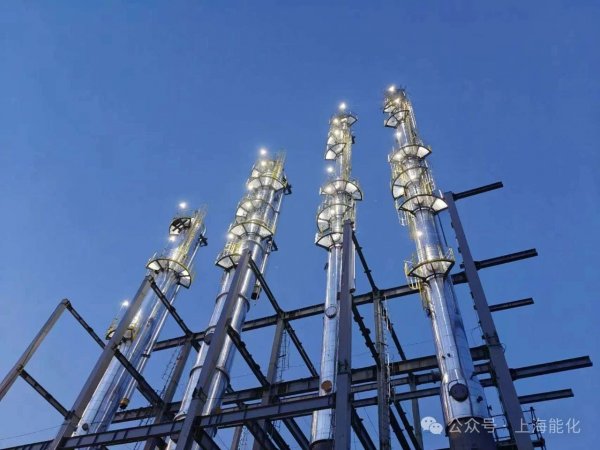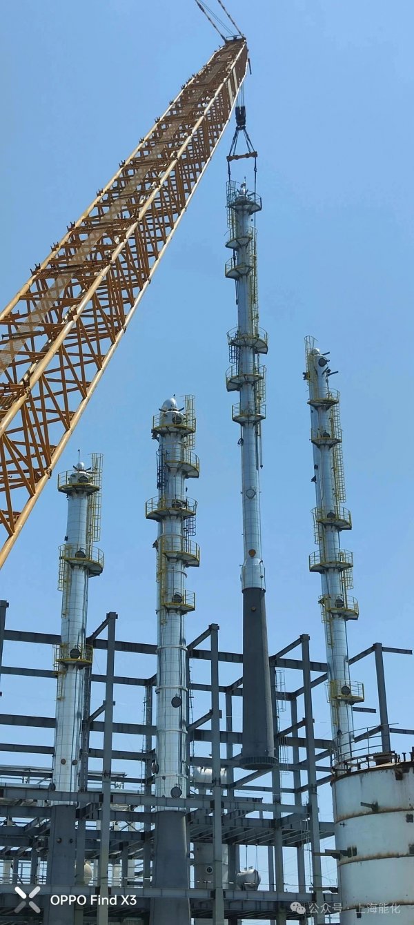 8月17日至20日,四臺精餾塔在完成“穿衣戴帽”后成功吊裝到位,順利實現“塔起燈亮”。