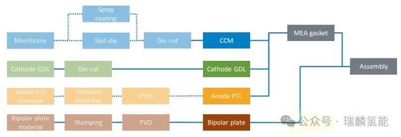 以下內(nèi)容梳理了當(dāng)下主流PEM電解槽所用材料、結(jié)構(gòu)形式以及各部件自下而上的制造思路。為便于量化,文中以 1 MW 電堆為參照,催化劑負(fù)載量取 2022 年商業(yè)化產(chǎn)品平均水平,未計(jì)入實(shí)驗(yàn)室級(jí)別的突破性數(shù)據(jù)。