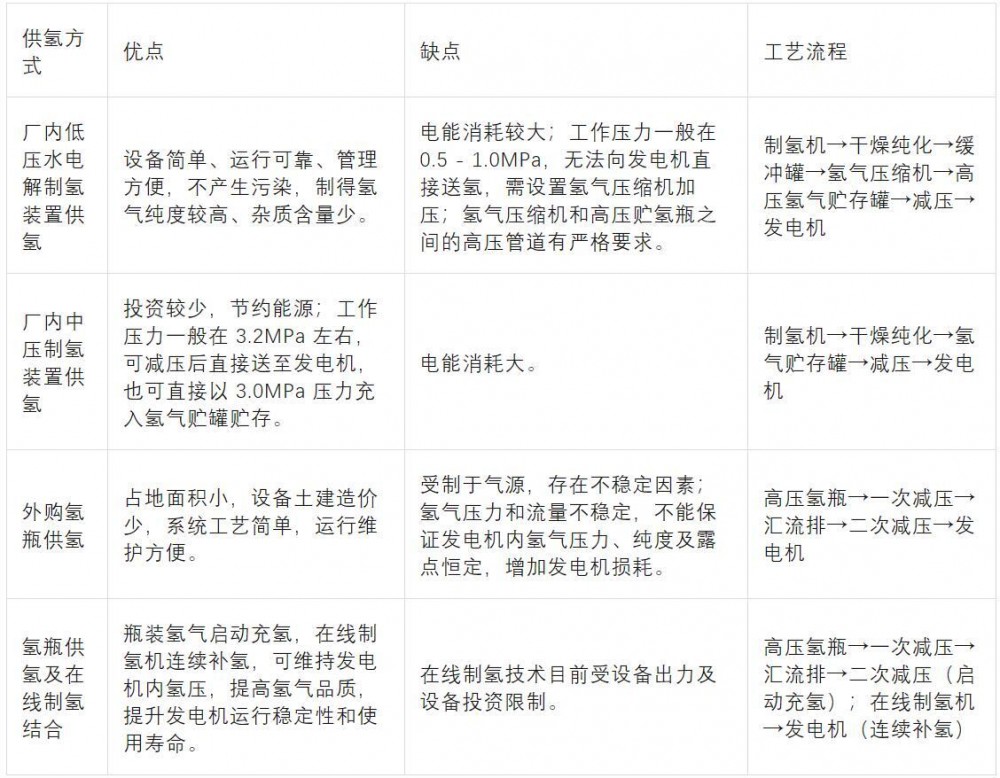 目前電廠內(nèi)的供氫系統(tǒng)主要有三種:廠內(nèi)設(shè)置水電解制氫裝置供氫、外購氫瓶供氫、直接通過管道供氫。此外,還有供氫和制氫相結(jié)合的模式,如通過瓶裝氫氣對發(fā)電機(jī)進(jìn)行啟動(dòng)充氫,通過在線制氫機(jī)對發(fā)電機(jī)進(jìn)行連續(xù)補(bǔ)氫。以下為幾種常見供氫方式的詳細(xì)對比: