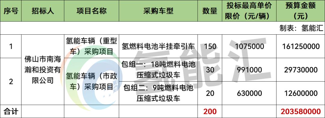 招標人為佛山市南海瀚和投資有限公司,累計采購氫燃料電池車200輛,預算金額總計20358萬元。