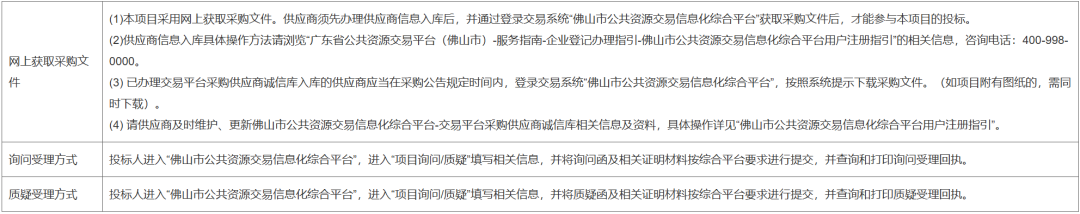 3、本項目采用網上獲取采購文件。供應商須先辦理投標人信息入庫后,并通過登錄交易系統“佛山市公共資源交易信息化綜合平臺”獲取采購文件后,才能參與本項目的響應。