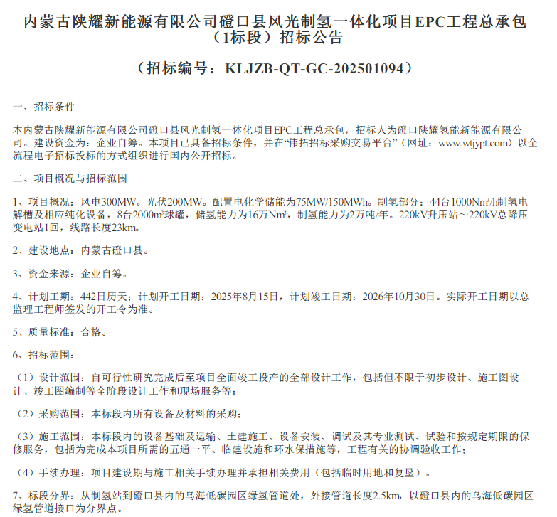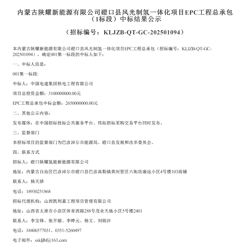 8月29日,內蒙古陜耀新能源有限公司磴口縣風光制氫一體化項目EPC工程總承包(1標段)中標結果公示。中標人為中國電建集團核電工程有限公司,項目總投資金額3100000000.00元,EPC工程總承包中標金額:2650000000.00元。