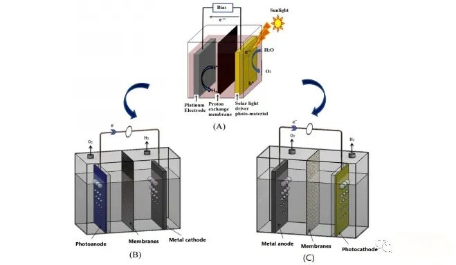 圖9:PEC電池的原理(a);光陽(yáng)極帶金屬陰極(B);光電陰極帶金屬陽(yáng)極(C)