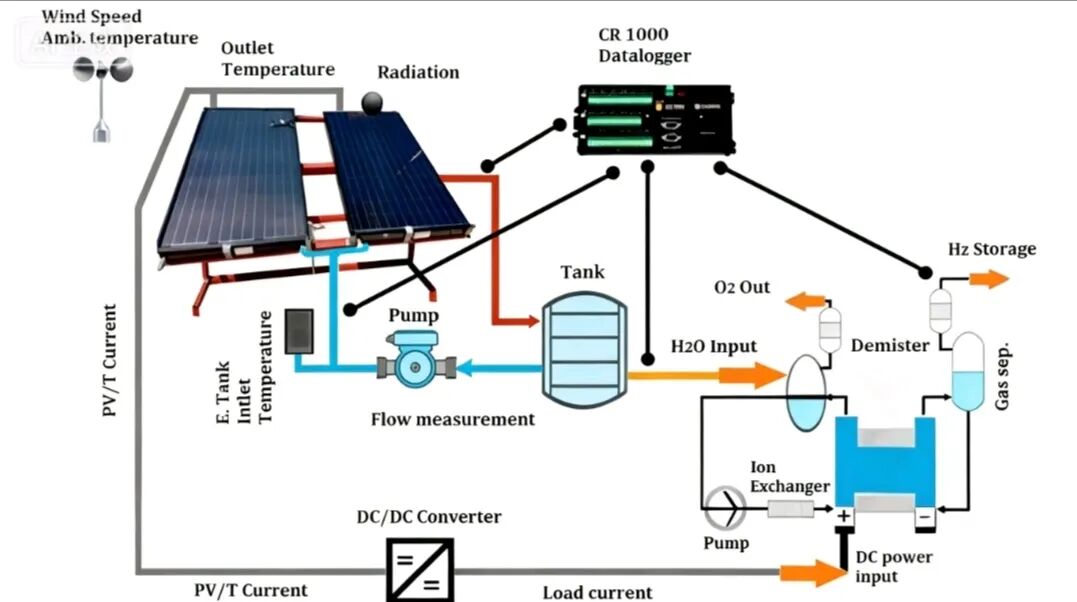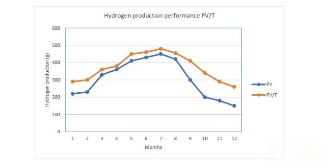 該系統(tǒng)結(jié)合了光伏發(fā)電與集熱功能,由PV/T板、DC/DC變換器和PEM電解槽組成。PV/T系統(tǒng)為電解槽提供電流并預(yù)熱進(jìn)水。利用PEM電解槽(PEMEC)進(jìn)行的年度測(cè)試數(shù)據(jù)對(duì)比了純PV系統(tǒng)與PV/T系統(tǒng)的月產(chǎn)氫量,表明PV/T系統(tǒng)因熱能利用具有優(yōu)勢(shì)。