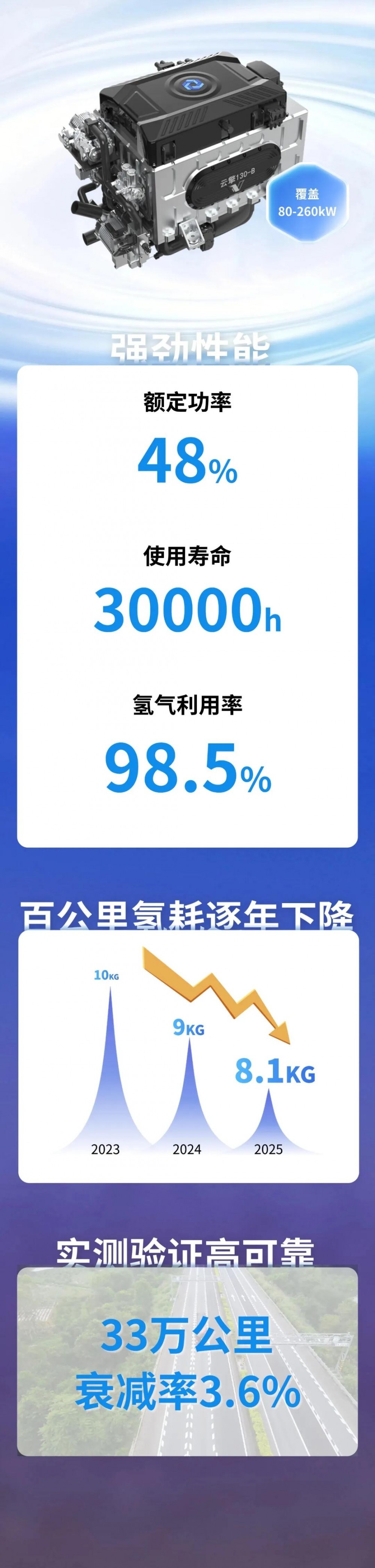 經過三年迭代,130B系統實現關鍵突破:質量功率密度躍升,額定工況效率突破48%,使用壽命延長至3萬小時,三項核心指標均達國內領先水平。截至目前,云韜氫能已申請100+專利,為下一輪產能擴張儲備技術。
