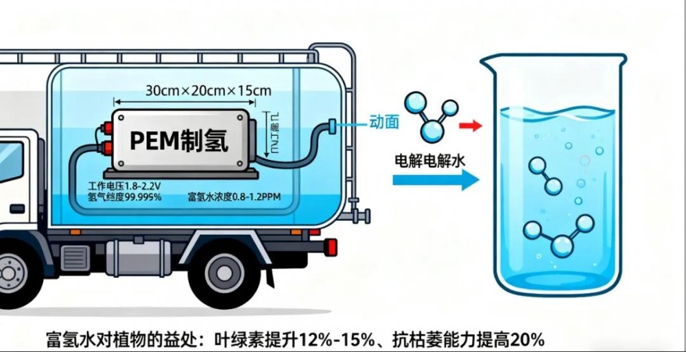 除氫動力系統外,這款灑水車的另一大創新亮點,在于水罐內集成了微型 PEM(質子交換膜)電解水模塊 —— 打破傳統灑水車 “只補水、不養護” 的局限,通過電解水產生氫氣并原位溶解于灌溉水中,生成濃度穩定在 0.8-1.2ppm 的富氫水,讓灌溉過程兼具 “補水” 與 “滋養” 雙重功能,為園林養護提供全新技術路徑。