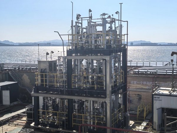 本次投運的甲醇合成撬塊采用高度集成化的撬裝設計,具備部署高效、占地集約、適應海洋復雜環境等突出優勢。集成的核心甲醇合成技術實現了低至6.9MPaG的合成壓力,二氧化碳單程轉化率超過80%,能夠將海上可再生能源制備的綠氫與捕集的二氧化碳高效、穩定地轉化為綠色甲醇。