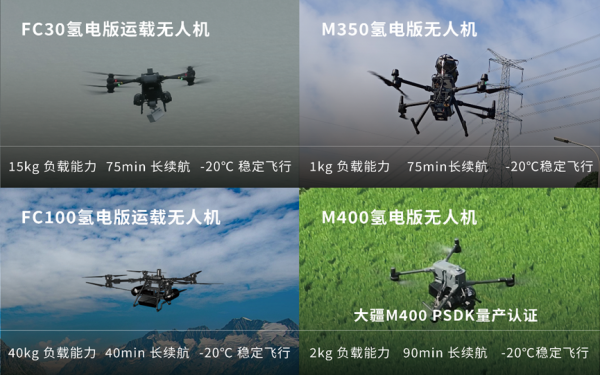 氫航科技作為氫動力系統在工業無人機行業應用的領路者之一,在2024年4月首次獲得大疆運載認可,達成FC30運載無人機的氫動力系統改裝合作,迄今已陸續推出M350、M400、FC100等多款機型的氫電版改裝產品,并在國網、南網等客戶的各類長航時、復雜環境作業任務中承擔重要角色。