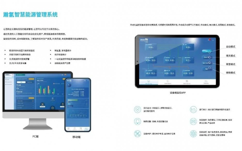智慧氫能平臺:智慧氫能平臺是一個以氫能為核心的多能融合的綜合解決方案,包括光伏逆變器、電解水制氫系統、儲氫系統、燃料電池發電系統、輔助電能系統和協同控制模塊。其工作原理是利用光伏產生的綠電電解水制氫并儲存,儲存的綠色氫氣可以通過燃料電池發電轉化回電力,制氫和發電過程產生的余熱可作為熱泵熱源。