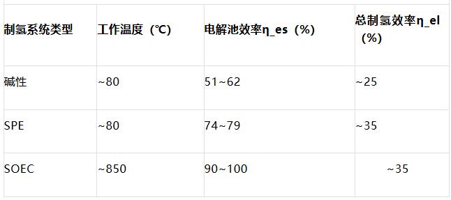 通過實驗數據與模型計算,三種典型電解系統的總制氫效率對比如下(表):